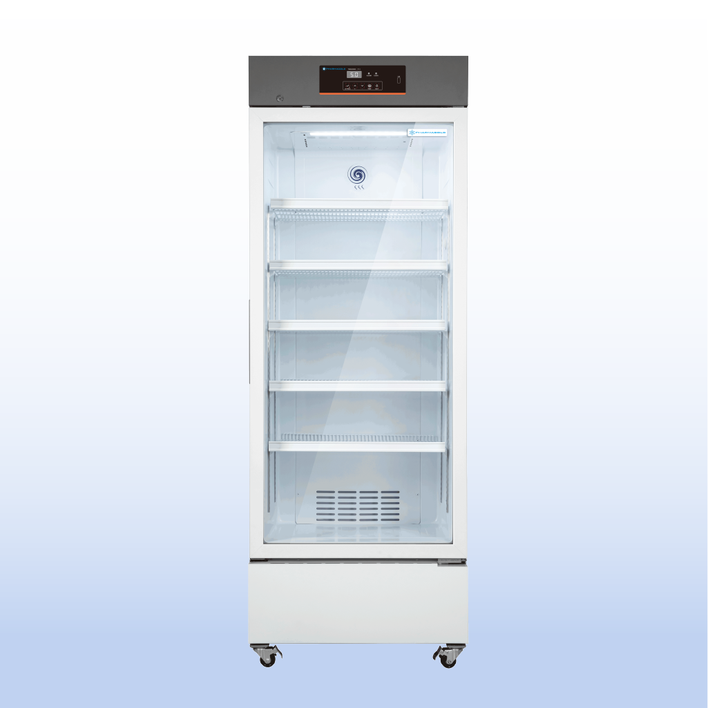 Pharmacy vaccine refrigerators feature precise temperature control, adjustable shelves, and rapid cool-down. They include LED lighting, alarms, and a CFC-free steel cabinet with R600a refrigerant.