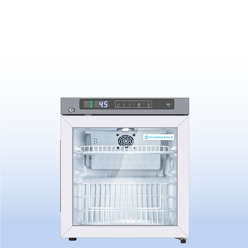 The Pharmacold NAB-60 is a versatile countertop vaccine fridge with a reversible door and adjustable shelves. It includes remote alarms, a backup battery, and forced air cooling for uniform temperature.